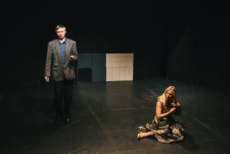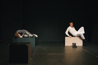 Doch worum geht es in „Die Suche nach Nyx“ nun eigentlich? Sein Stück in drei Sätzen zusammenzufassen, fällt Hegemann nicht leicht. Auch als ich auf fünf Sätze erhöhe, hat er noch immer Schwierigkeiten. Besonders verwunderlich ist das nicht: „Die Suche nach Nyx“ lässt sich nicht gerade einfach in Worte fassen. Zentrale Figur der Geschichte ist Linus, gespielt von Sören Messing. Linus wird von seiner Mitschülerin Melanie (Annalena Storch) erschossen – und das gleich mehrmals. Den Zuschauer:innen ist dabei nie so ganz klar, ob das Gesehene nun gerade real ist oder im Traum passiert. Träumt Linus? Ist er wach? Was von dem, was gerade geschieht, ist echt und was nicht? Orientierung, aber auch weitere Verwirrung bringen zwei Traumgestalten, dargestellt von Sandra Lühr und Alexander Bussmann. „Das macht doch alles keinen Sinn!“, ruft Linus verzweifelt und wird von ihnen sogleich korrigiert: „Nein, nein, nein, das macht noch keinen Sinn.“