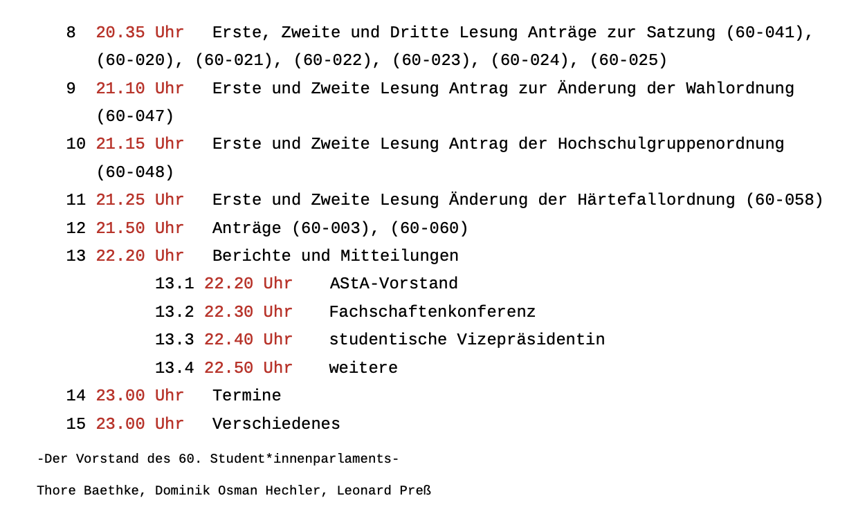 Der Antrag-Speedrun nimmt langsam (ca. 2 Stunden nach Ankündigung) Fahrt auf. In Rekordzeit wird ein Antrag zur Quotierung des StuPa-Vorstands angenommen, sodass dieser nur noch zu zweit besetzt wird. Weitere Anträge werden einstimmig angenommen. Einmal zur Anpassung der Arbeitszeiten von Ausschüssen; danach zur Anpassung der FSK-Satzung, die allen Studierenden Rederecht in den FSK-Sitzungen erteilt. Drittens ein Antrag zur Optimierung der Arbeit des Wahlprüfungsausschuss, viertens dass der Rechnungsprüfungsausschuss nicht zwingend für eine Prüfung verantwortlich ist. Ein redundanter Antrag wird zurückgezogen, ein weiterer vertagt. Es gibt laute Freude im StuPa, dass sie ihren Job produktiv machen. Eine neue Härtefallordnung, die besser organisiert sein soll, wird von Viktoria vorgestellt. Größere Änderungen habe es zum Beispiel bei der Digitalisierung gegeben, weil aktuell das meiste noch ausgedruckt wird. Die Diskussion wird vertagt.